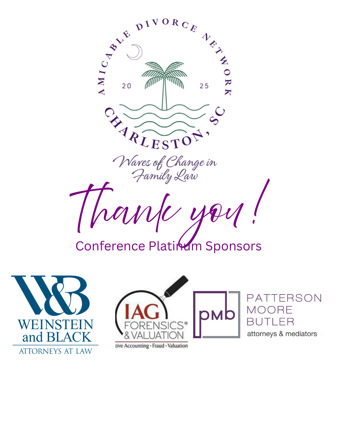 Join us September 3-5, 2025 In Charleston, South Carolina for our annual conference! In 2025 we are learning all about the "Waves of Change in Family Law." All Amicable Divorce Network members and non-member professionals are invited to participate in specialized interdisciplinary training. This conference will consist of two days of innovative trainings and workshops set at the beautiful Charleston Harbor Resort. #1 Resort in South Carolina, Condé Nast Traveler Readers’ Choice Awards #2 Resort in the South, Condé Nast Traveler Readers’ Choice Awards #4 Waterfront Hotel, USA Today 10 Best Readers’ Choice Awards #6 Hotel Spa in the US, USA Today 10 Best Readers’ Choice Awards One of the Best Hotels in the World, Fodor’s Travel Our event is hosted in the Beach Club section of the hotel. The number of rooms set aside for our event is limited. Please note hotel registration is entirely separate and is at the link provided. Hotel rooms are additionally limited at the conference pricing. Click to move to the registration page to view more information. Agenda and more details will be updated on our conference booklet which details our speakers, sponsorship levels and more and can be viewed here: