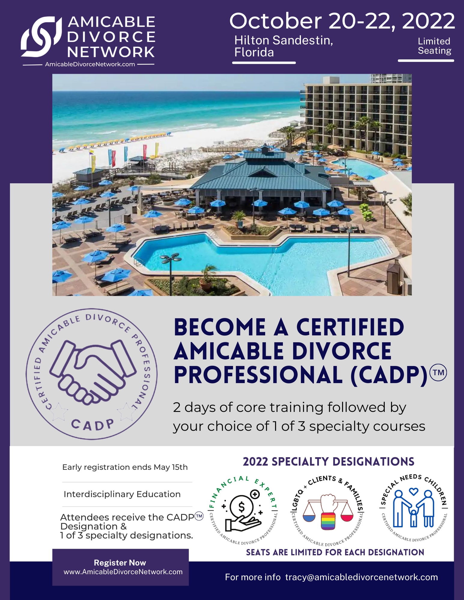 The first of its kind, this innovative training will set the standard for being an Amicable Divorce Professional. Certified Amicable Divorce Professional Training, October 20-22, 2022, Hilton Sandestin, Florida. Amicable Divorce Network members are invited to participate in specialized interdisciplinary training to receive the Certified Amicable Divorce Professional ™ (CADP™ ) designation. This course will consist of two days of core training. On the third day, attendees will split into three different breakout sessions to receive the specialty designation of their choice. The 2022 Specialty Designations are: Special Needs Children, LGBTQ+ Parties and Families, and Financial Expert. We look forward to coming together to help parties on the Amicable Road to Resolution. Click to move to the registration page to view out agenda.