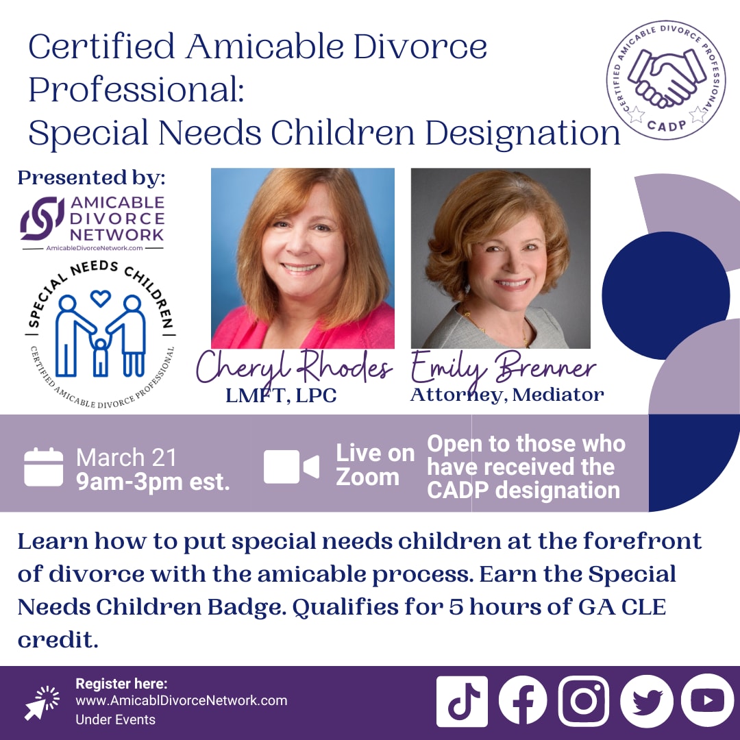 For members of the Amicable Divorce Network who have already achieved the Certified Amicable Divorce Professional Designation, you can add to your specialty designations with the Special Needs Children Designation. Join us on Zoom to learn about the unique challenges that a special needs child can present to a family facing a divorce. Learn what you need to know, consider for settlement and how an amicable divorce can assist parties with a child-focused approach. This event qualifies for 5 hours of GA CLE credit. If you are not a GA attorney, you will be given a certificate of completion for the course as well as an agenda and materials that you can submit to any authority that issues your continuing education credit. This event is from 9am eastern (8am central) until 3pm eastern (2pm central).Images