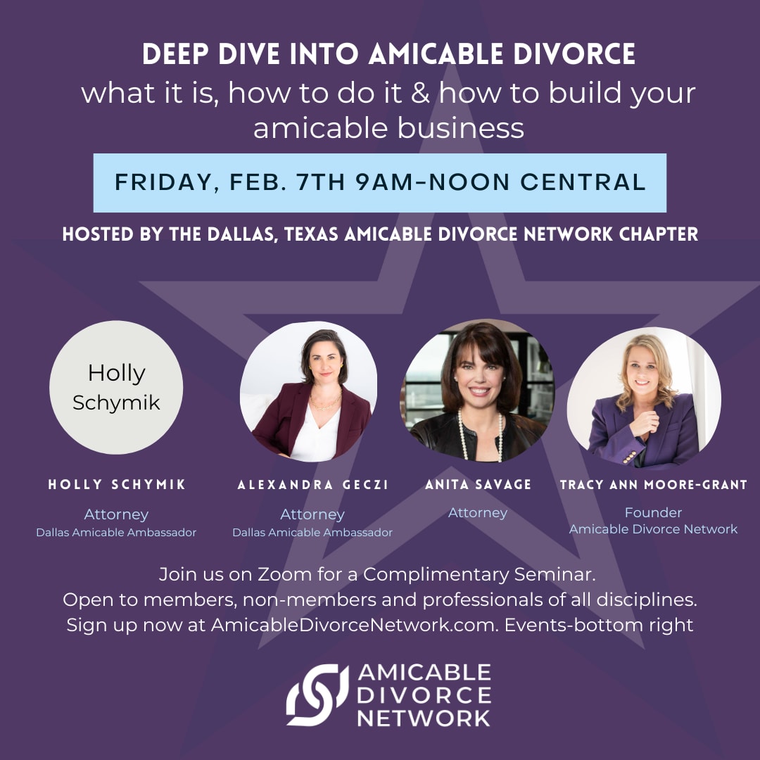 All professionals- Amicable Divorce Network members and non-members, those in Texas and those not in Texas, and professionals of all disciplines-are invited to join us for this online seminar. We will discuss what an amicable divorce is and Texas lawyers Alexandra Geczi and Anita Savage will discuss how they jumped in and handled their first Amicable Divorce. We will be discussing how this divorce is different from uncontested, collaborative and contested divorce and how to build an amicable practice with Amicable Divorce Network founder, Tracy Ann Moore-Grant. We anticipate this event will qualify for 3 hours of continuing education credit and we will provide you an agenda, speaker bios and materials to self submit. A Certificate of Attendance can also be provided. There is no charge for this event.Images