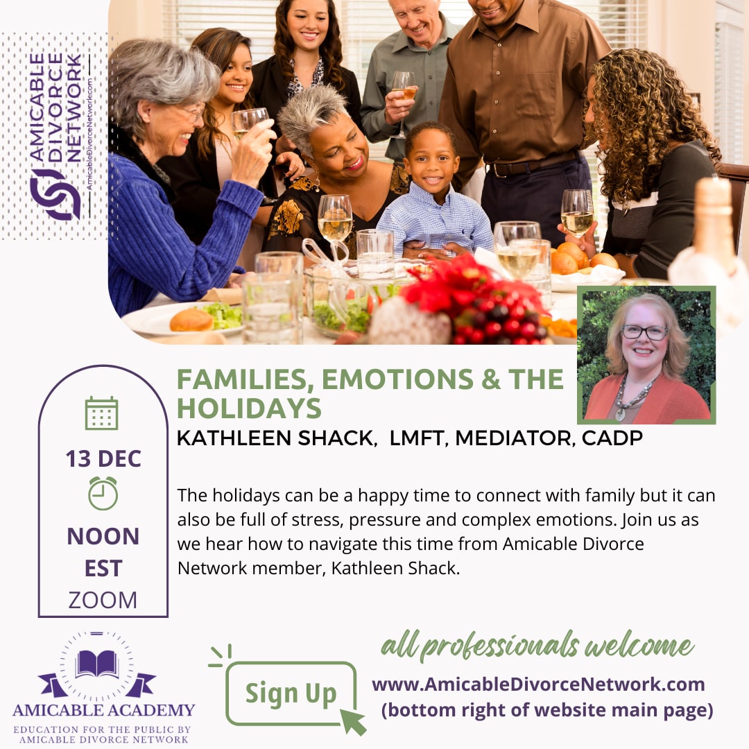 Kathleen Shack is an experienced Licensed Marriage and Family Therapist, Certified Gottman Couples Therapist, Certified Discernment Counselor, Collaborative Divorce Coach, Child Specialist, Certified Amicable Divorce Professional (CADP) and Registered Divorce Mediator. She is the Founder and CEO of Family Solutions Counseling, LLC.She has over 20 years of experience working with couples, families, individuals, divorced families, blended families, same-sex couples and families, and children. Join us for this presentation on Families, Emotions & the Holidays. The holidays can be a tough time for anyone with stress, pressure and family dynamics. Join us for this Amicable Divorce Network presentation. This event is open to all professionals.Images