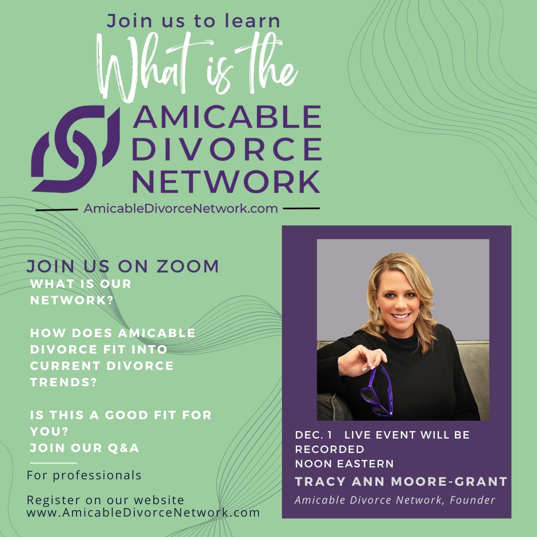 Professionals interested in membership in the Amicable Divorce Network are encouraged to join us for this live presentation by ADN founder, Tracy Ann Moore-Grant, followed by a Q&A. This event is open to all professionals and is live on Zoom. Please note the time is 11:00am CENTRAL time.Images