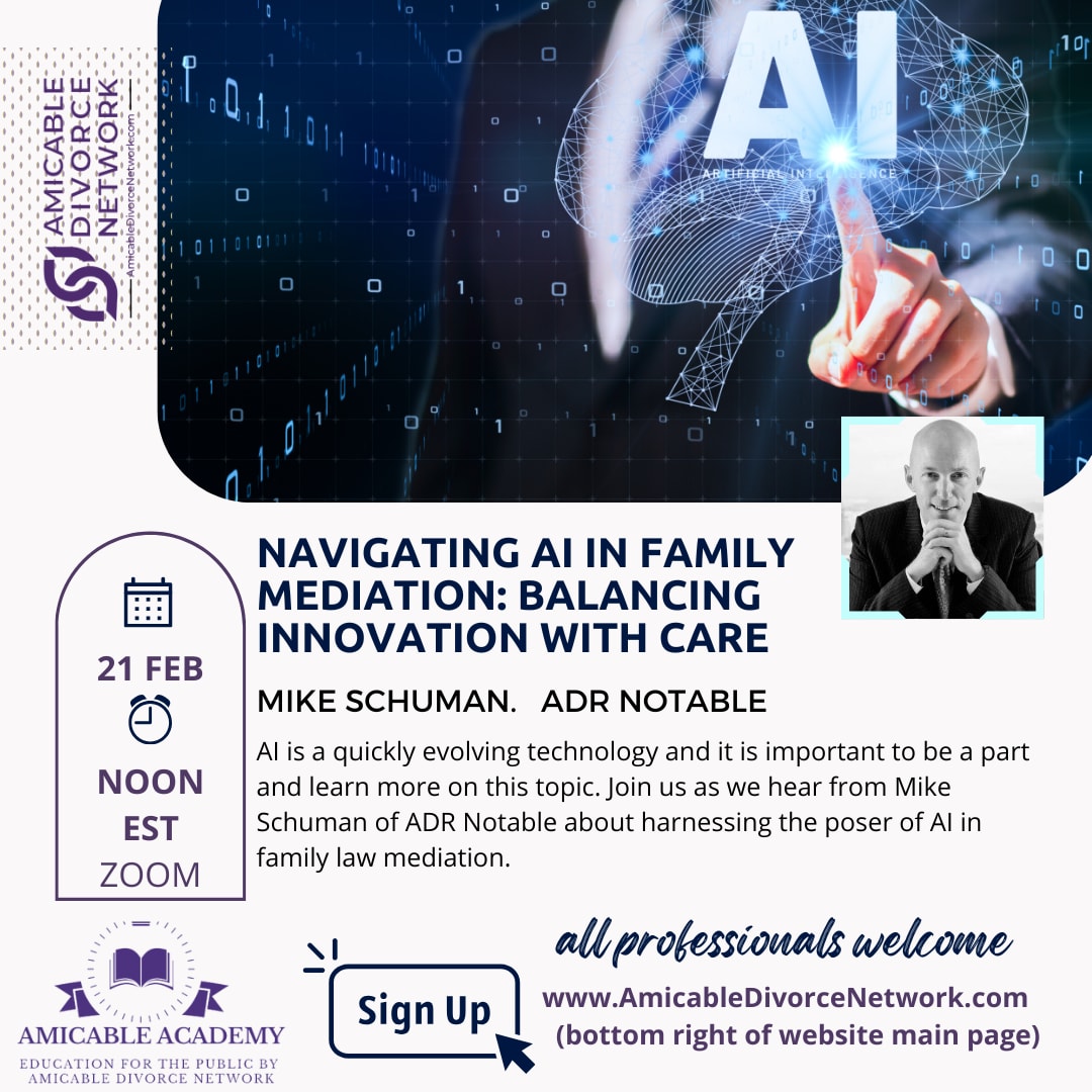 Join Amicable Divorce Network for Navigating AI in Family Mediation: Balancing Innovation with Care. This event is online and open to all professionals, members and non-members. Our presenter is Mike Schuman of ADR Notable.